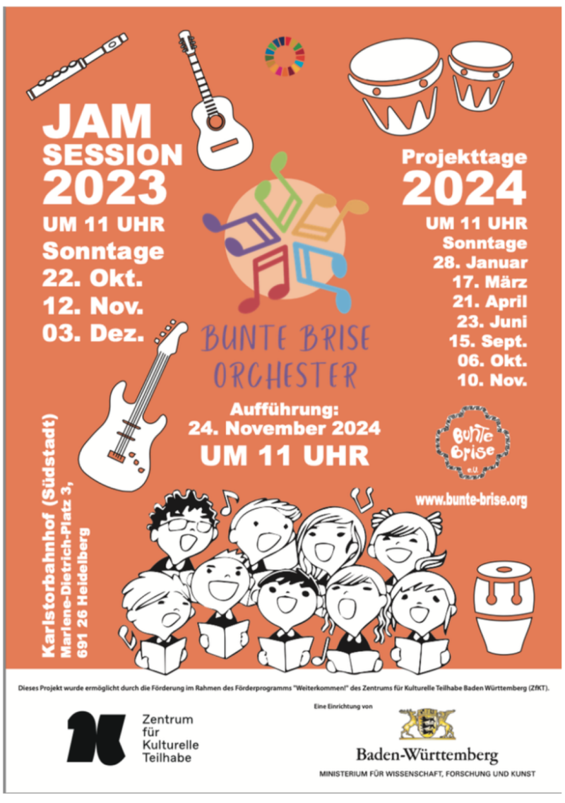 Innerhalb der Trägerorganisation Bunte Brise wirke ich in einem Ensemble mit, das regelmäßig auftritt und sich der spanisch-lateinamerikanischen Musik widmet. Das Projekt vereint Fachkräfte aus den Bereichen Klavier, Bass, Perkussion, Gitarre, Querflöte, Chorarbeit und Tanzpädagogik. Darüber hinaus bietet es gezielte Unterstützung für Kinder, die Streich- oder Blasinstrumente erlernen möchten.